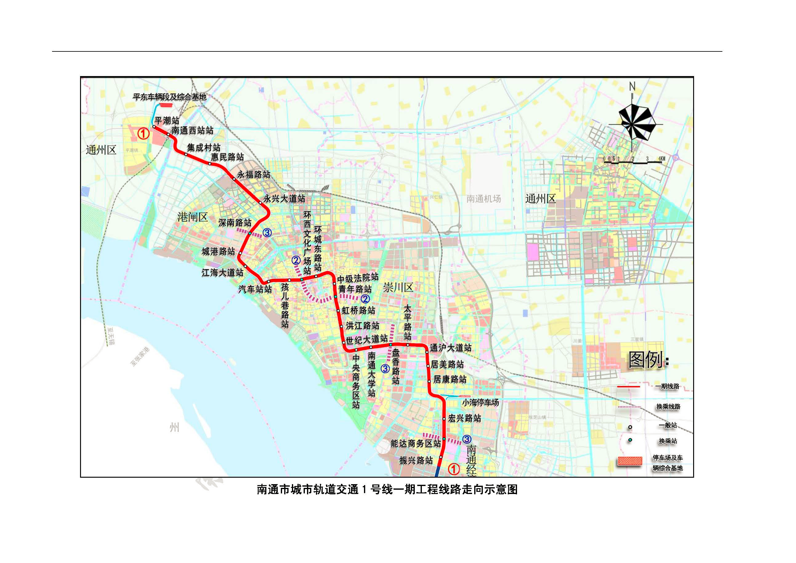 项目概况:南通市城市轨道交通1号线一期工程起点设置于通州区平潮站,线路出站后经由沪通铁路南通西站→长泰路→永和路→纬六路→人民路→工农路→崇川路→新开路→通盛大道进入开发区能达商务区,设终点站振兴路站,线路全长39.4km,均为地下线,共设车站28座;设控制中心1座,设车辆段和停车场各1处。