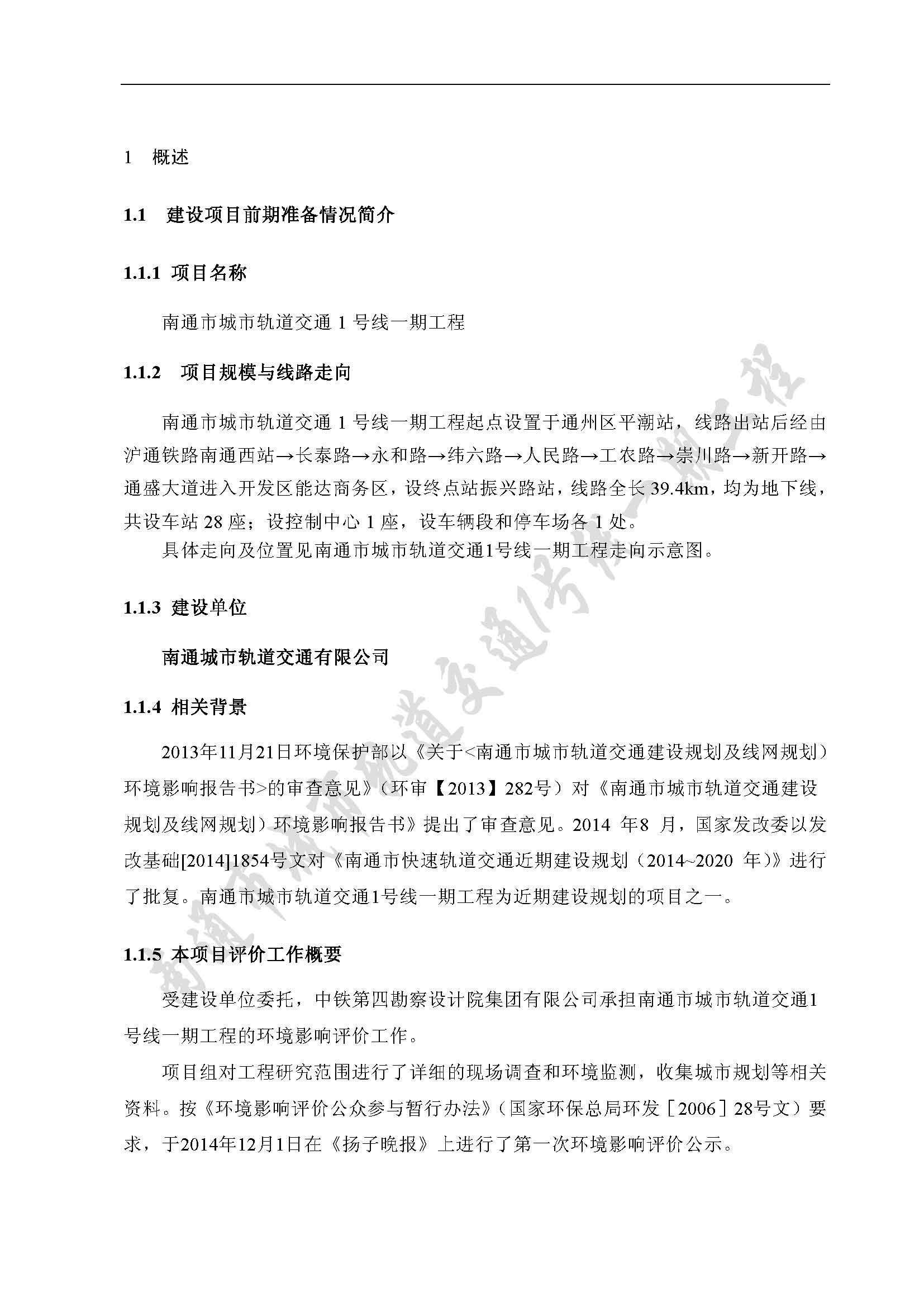 南通市城市轨道交通1号线一期工程环境影响评价第二次公示