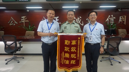 2017年8月1日下午,武警南通市消防支队专程将一面写着“高效规范、勤政廉洁”的锦旗送至市公共资源交易中心,并感谢市公共资源交易中心在武警南通市消防支队政府采购项目中给予的大量支持与帮助。